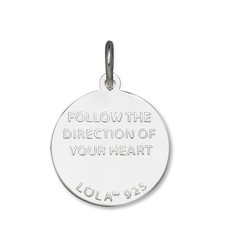 On the back, “Follow the direction of your heart.” “What lies behind us and what lies before us are tiny matters compared to what lies within us.” Ralph Waldo Emerson. Sterling silver with enamel inlay.